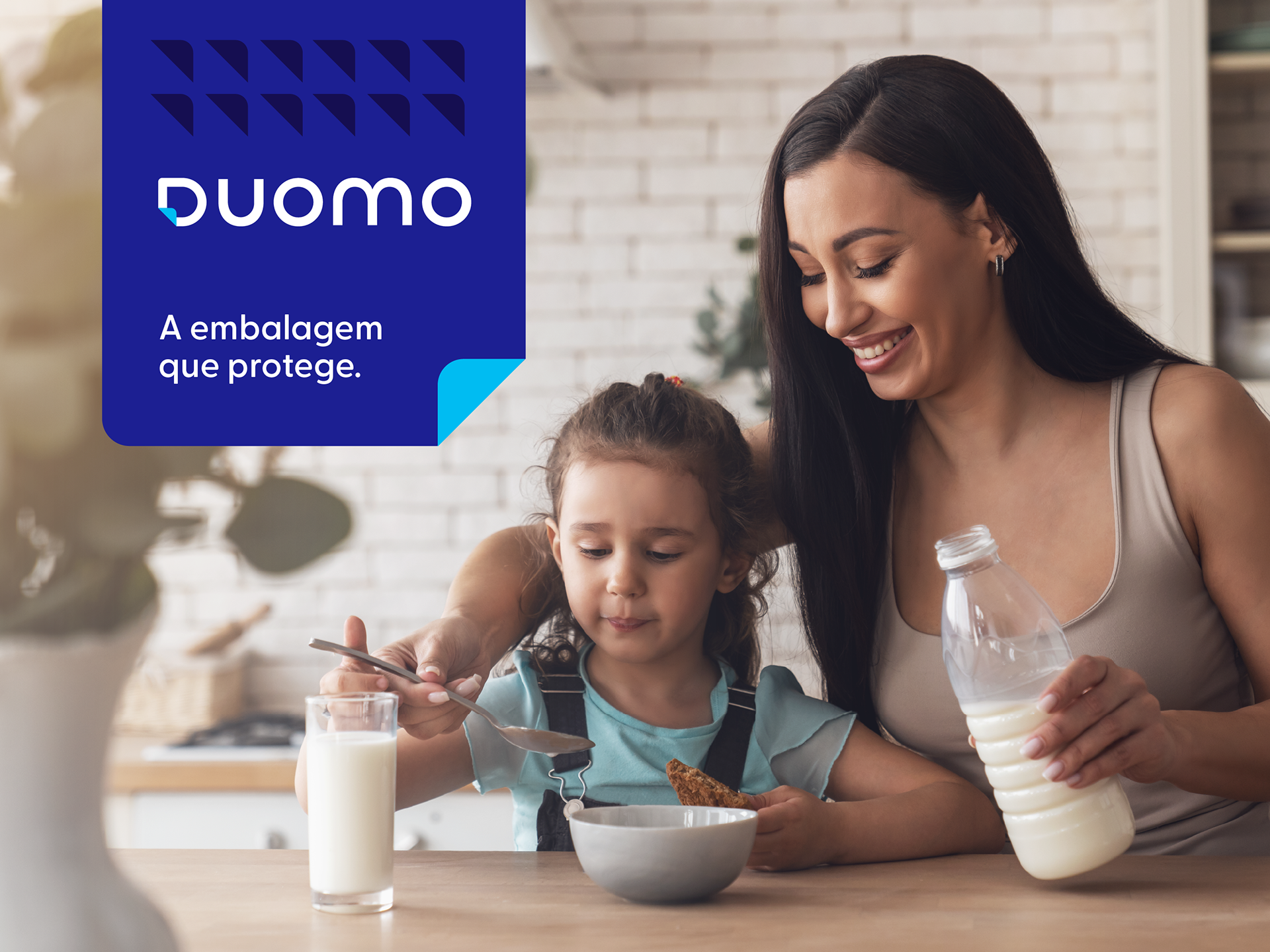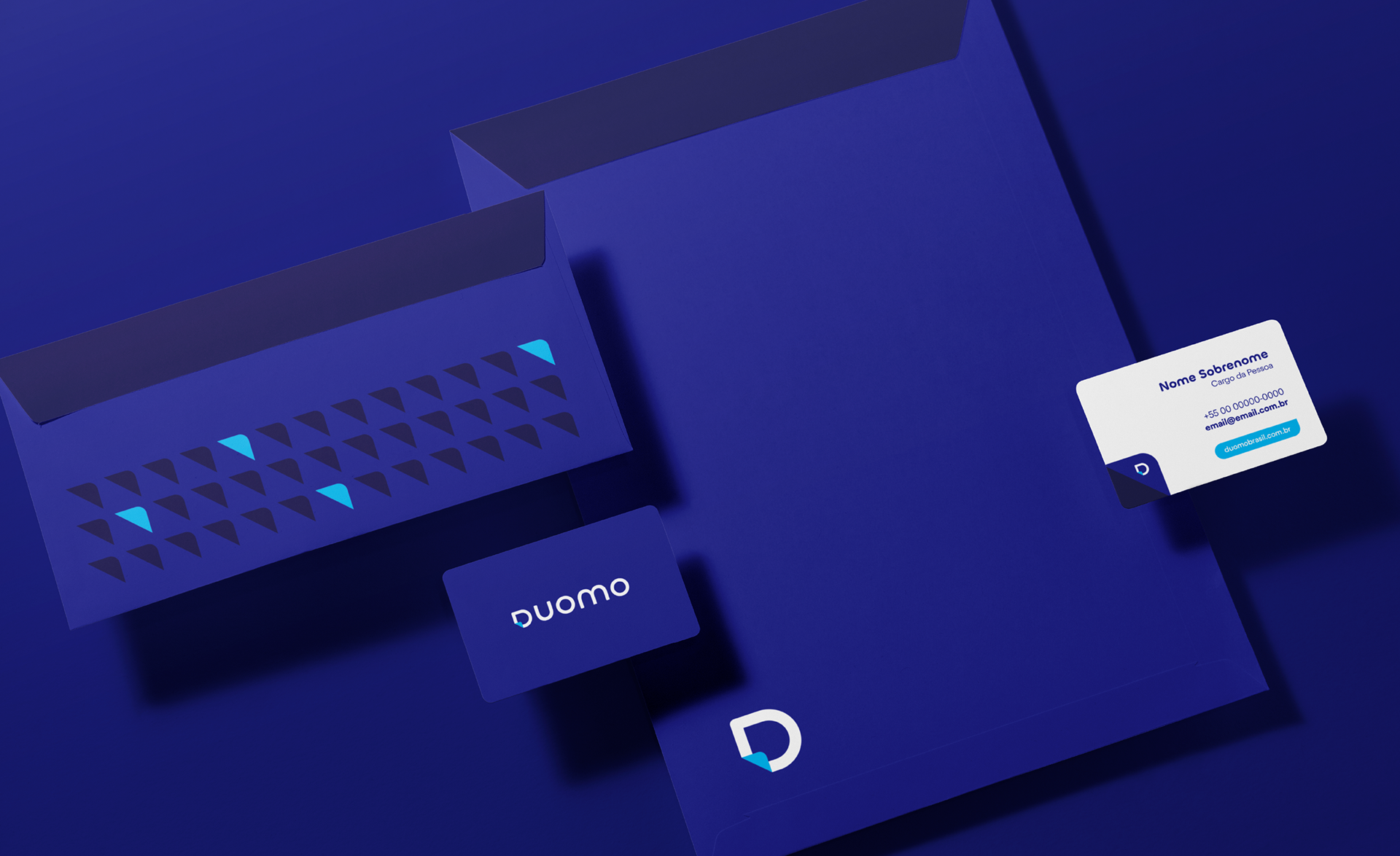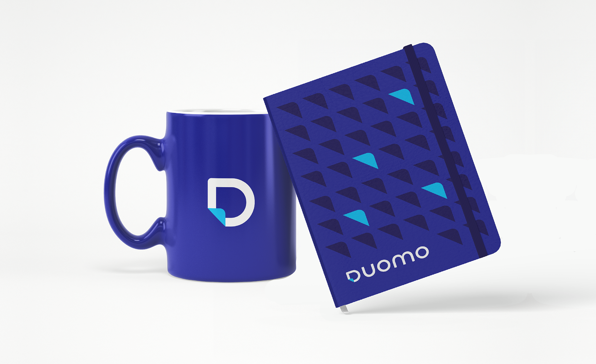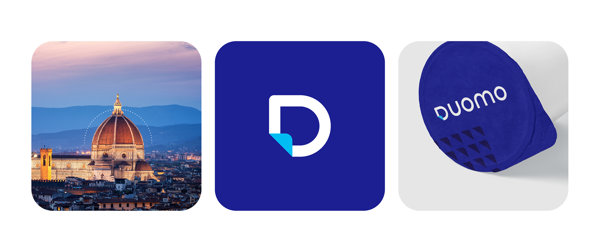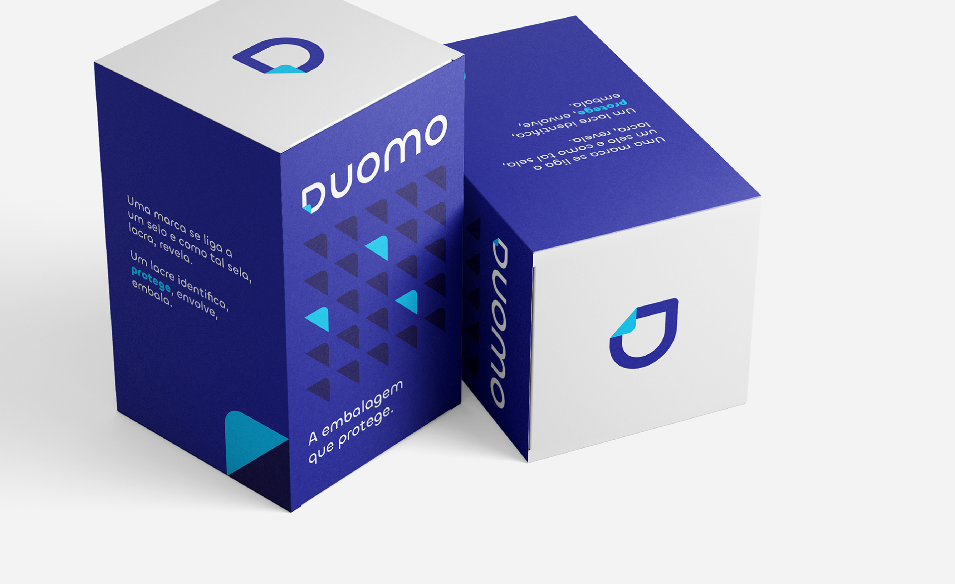 A Duomo, já consolidada no ramo de selos para lacres de embalagens alimentícias, buscava modernizar sua marca sem perder a consistência de uma empresa experiente. O resultado foi um logotipo que faz alusão ao nome e, ao mesmo tempo, ao produto oferecido. O principal elemento visual da identidade ficou sendo a aba do selo, que representa também uma seta ascendente (crescimento) e a virada de página que a Duomo buscava.